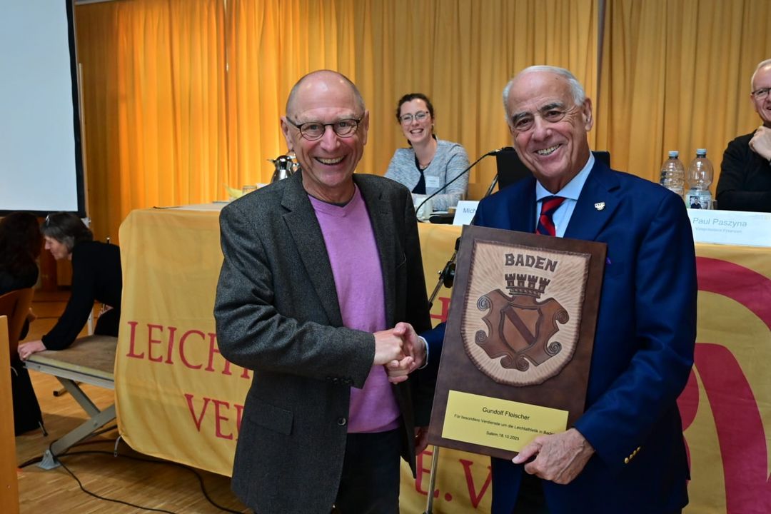 Mit dem Badenschild, der höchsten Auszeichnung des Verbands für Nichtmitglieder, wurde der Präsident des BSB Freiburg, Gundolf Fleischer geehrt. Zuvor hatte Fleischer in einem Grußwort die Anwesenden eindrücklich auf die derzeitigen sportpolitischen Herausforderungen auf Landes-, insbesondere aber auch bundespolitischer Ebene, hingewiesen. Seit vielen Jahren setzt sich Fleischer erfolgreich für die Leichtathletik – wie auch andere Sportarten – ein. Mit der Umsetzung des Ausbaus der Sportschule Steinbach hat er maßgeblichen Anteil daran, dass die Leichtathletik heute „ein solch hervorragendes Zuhause für seine Traineraus- und -fortbildung hat“, so Michael Schlicksupp.